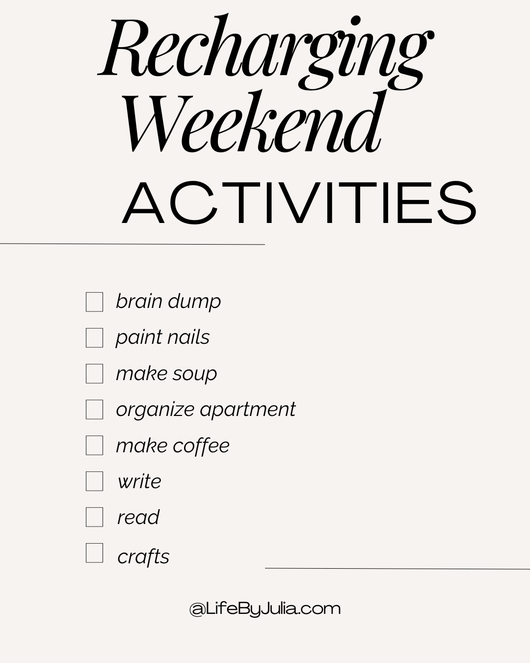 Weekends are a time to take care of yourself. Being intentional with your free time is an important step in creating a life you love.